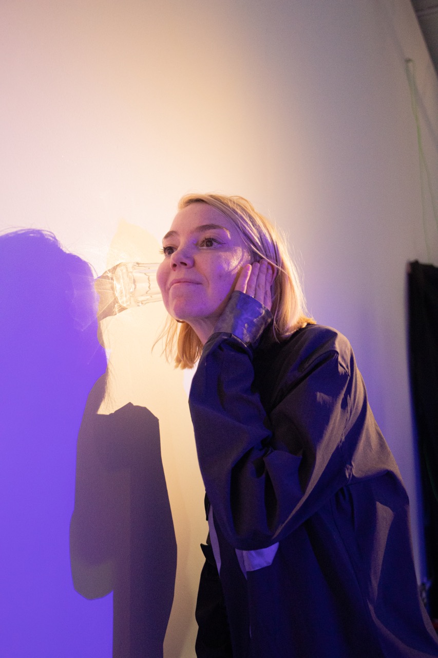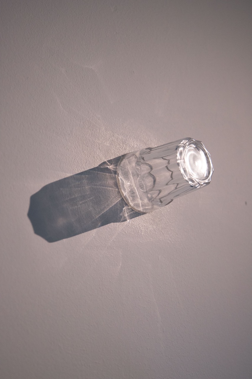 Untitled, (Glass) is a site-specific work installed at Elthorne Road Studios, Central Saint Martins in London. The tumbler, attached to a wall of the exhibition space in the Studios, takes on the shape of a symbolic object which acts as a catalyst to establish the link with an outside, creating a spatial connection within the building. Listening through it, we cross the fluid wall to eavesdrop on the noises and sounds of a passage area on the upper floor, where I placed a hidden microphone. A glimmer into what is happening across the boundary opens up to us: the act of dwelling, or in other words living itself.